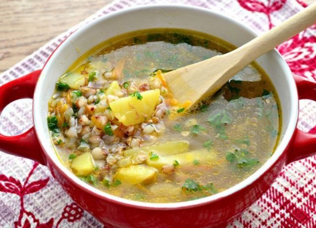 - Tegye a burgonyát a forrásban lévő húslevesbe, 5 perc múlva és a gombát zöldségekkel. Hagyja jól forrni, majd öntse a hajdinát.