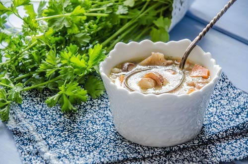 - Főzzük a levest fagyasztott gombával és csirkével, amíg a burgonya meg nem fő.A főzés végén ízesítsük sóval és fűszerekkel. Tálaláskor gyógynövényeket és tejfölt adhat a tányérhoz.