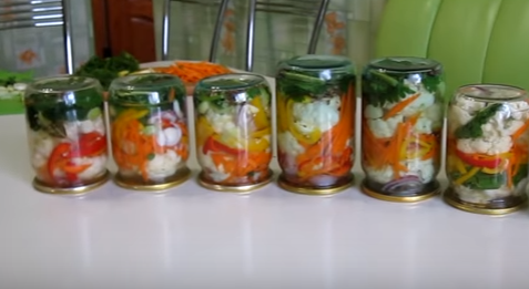 Keverje össze az összes hozzávalót vízzel és forralja fel. Ugyanakkor vegyen tiszta, sterilizált üvegeket, és tegye beléjük zöldségeket rétegenként: egy réteg karfiol, majd sárgarépa, megint egy színes fajta, majd paprika, zeller stb. Amikor a korsó zöldségekkel van megtöltve a vállán, öntsön forró pácot tartalmára.