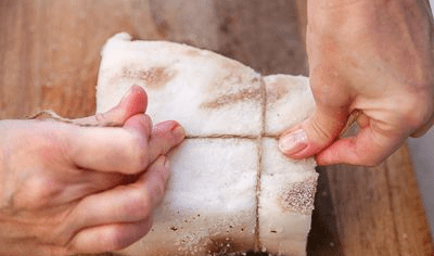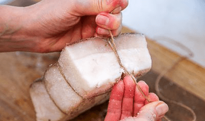 - Fonja tovább a szalonna alsó darabjáig. Ezután fordítsa át a másik oldalra, és húzza a húrt a kialakított hurkok közé, meghúzva a csomókat.