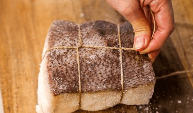 Megkötik a húst, hogy kényelmesebb legyen előbb a füstházban felakasztani, majd szellőztetni: