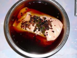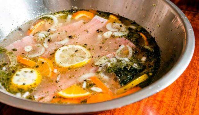 Az összes hozzávalót a fokhagymát apróra vágva adjuk a vízhez. A folyadékot felforraljuk, 3-4 perc múlva levesszük a tűzről és szobahőmérsékletre hűtjük. A szegynek ebben a pácban kell feküdnie 5-6 órán át.