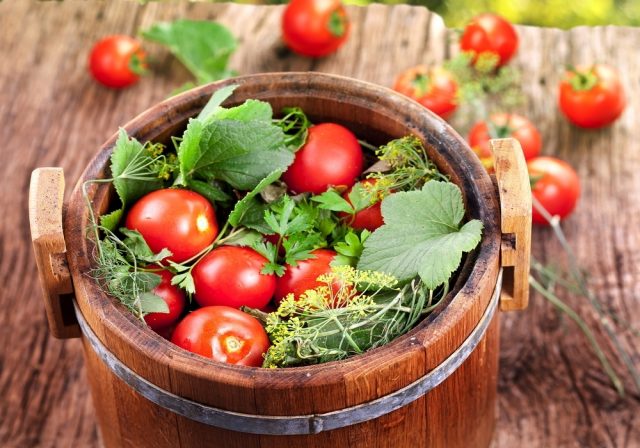 Recept hordós paradicsom egy vödörben, torma, cseresznye és ribizli levelekkel