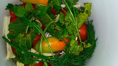 - Fektesse őket egy réteg zöldre, ne felejtse el hozzáadni, amikor a vödör megtelik. Fűszereket és fokhagymát is forgalmaznak. A tetején zöldnek kell lennie.