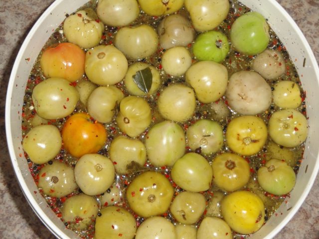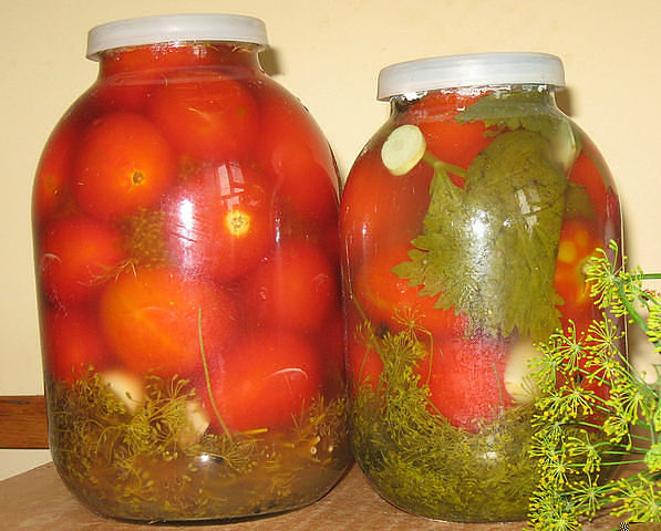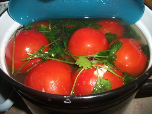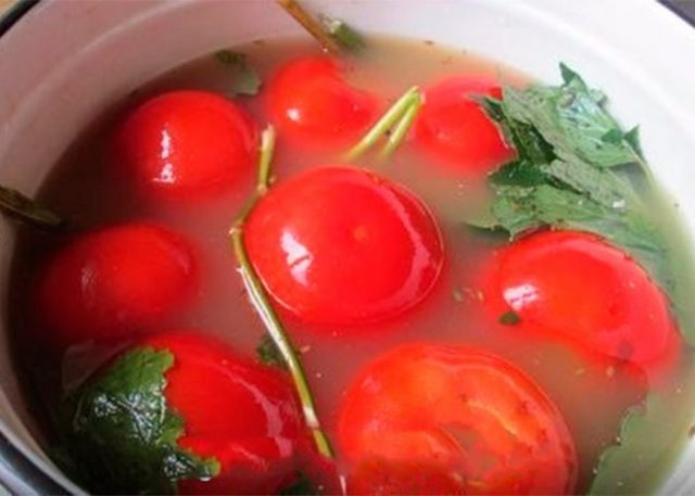 Opcionálisan két hüvely forró paprikát tehet. A sóoldat mennyisége a paradicsom méretétől függ, be kell őket borítani. Minden liter vízhez 2 evőkanálnyit kell tenni. l. só és 1 evőkanál. l. kristálycukor.