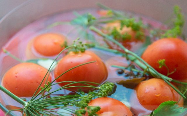 - A paradicsomot fektetik, fokhagymával, gyógynövényekkel és kaporral.
