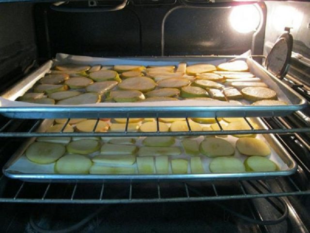 - A sütőt 60 ° C-ra melegítik.2 órás párolás után a melegítést 80 ° C-ra növeljük, és addig szárítjuk, amíg a szeletek méretét csökkentik. Ezután a hőmérsékletet 55 ° C-ra csökkentjük, és főzésig pároljuk. Amikor megnyomja a gyümölcsöt, nem szabad levet engednie belőle.