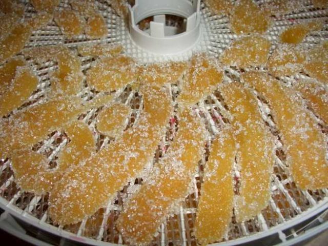 Öblítse le a dinnyét, vágja két részre, kanalazza ki a magokat. Ezután a gyümölcsöt meg kell hámozni és csíkokra vágni. Ha otthonában elektromos szárító található, helyezze a vágott darabokat szakaszokra, és egymásra rakja őket. Csukja be, kapcsolja be a zöldségszárítót, állítsa a hőmérsékletet +58 fokra és az időzítőt 8 órára. Az idő lejárta után változtassa meg a szakaszokat úgy, hogy az utolsó legyen az első.Hosszabbítsa meg a szárítást ugyanabban az üzemmódban további 4 órán át. Ha lejár az idő, a kandírozott gyümölcsök készen állnak.