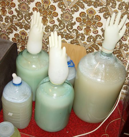 - Most vízzárat helyeznek el, vagy orvosi kesztyűt helyeznek a tartály nyakára a mosógép helyett. Az ujján egy kis lyukat készítenek a gázok távozásához.