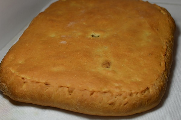 - Tegye a tölteléket az alapra. Hagyja szabadon a széleket. Fedjük le a maradék réteggel. Készítsen egy bemetszést a közepén, hogy a gőz könnyen megtalálhassa a kiutat.