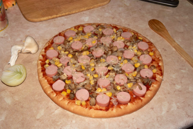 A tésztalapot majonézzel és ketchuppal vonják be. A tetejére mézgombát terítenek. A kolbászt ajánlatos apró kockákra vagy szalmára vágni. A tölteléket apróra vágott hagymakarikákkal kell kiegészíteni, és reszelt sajttal letakarni.