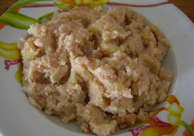 - Öntsön olajat egy üvegből burgonyapürébe, tegye a májat és a hagymát, és alaposan keverje össze.