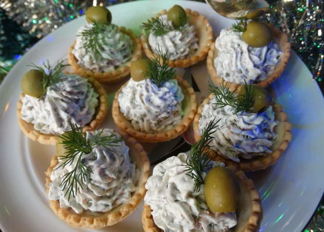 A túrós pástétom jól néz ki a gyógynövényekkel és olajbogyókkal ellátott homoktartlettekben