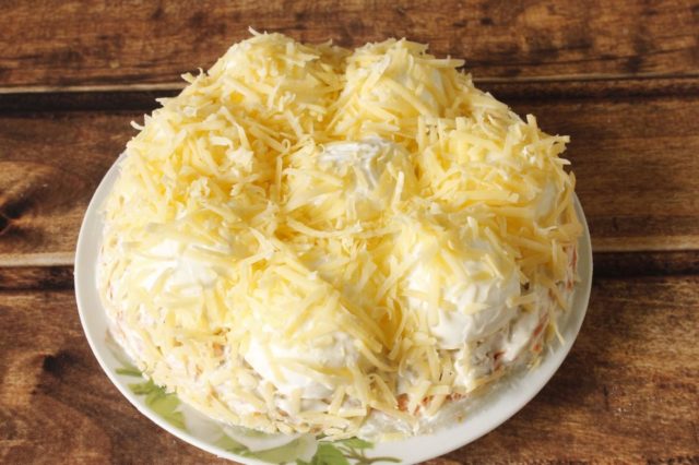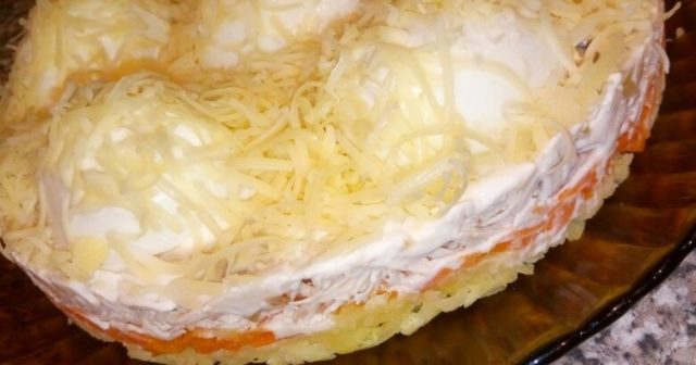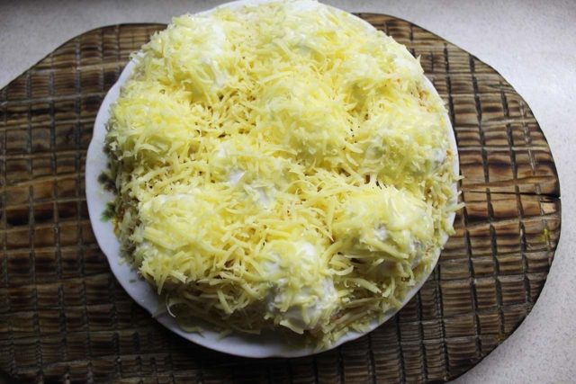 - Krumplit reszelünk. Vegyünk egy széles tányért, fektessük le az aljára. Fűszerezzük sóval, kenjük meg majonézes öntettel. Ezután ugyanúgy vonja be az alkatrészeket.