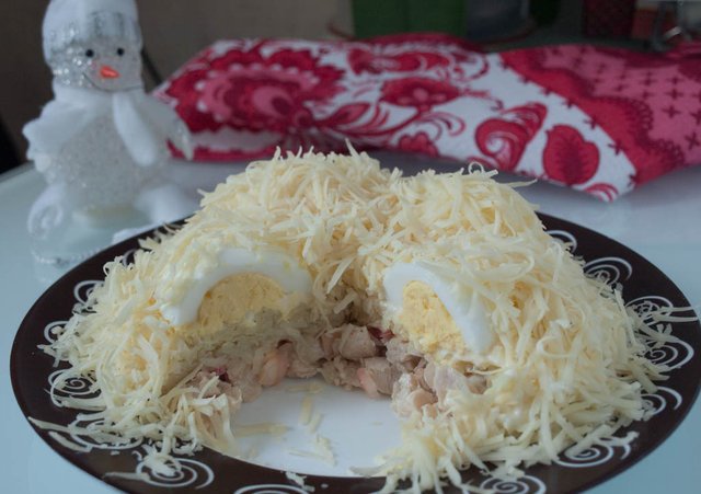 - A következő rétegekből formáljon "hókupacot": csirke, gomba, tojás.