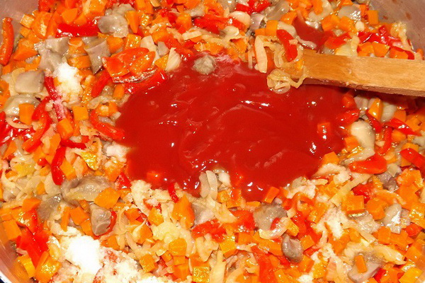 - Kombinálja a paradicsompürét vízzel. Öntsük a borsot, majd adjuk hozzá a hagymás-gombás sütést. Keverjük össze. Zárja le a fedelet, és hagyja alacsony hőmérsékleten fél órán át, időnként megkeverve.
