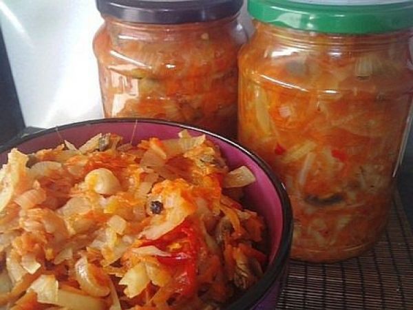 - Az olajban sárgarépát és hagymát sütünk aranybarnára. Öntsük a káposztára.Zárja le a fedelet és párolja negyed órán át.
