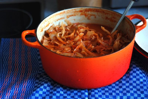- Hozzáadunk vajat, paradicsomot, paradicsompürét és káposztát. Sózzuk és édesítsük.