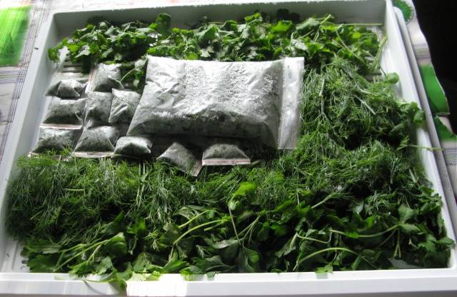 A táskában előkészített masszát alá kell írni, és a tasakot fel kell tekerni vagy meg kell kötni. Ha nem írja alá a zsákokat, akkor a zöldség zöld tömege összetéveszthető egy másik fűszerezéssel, amelyet szintén elfagyaszthat.