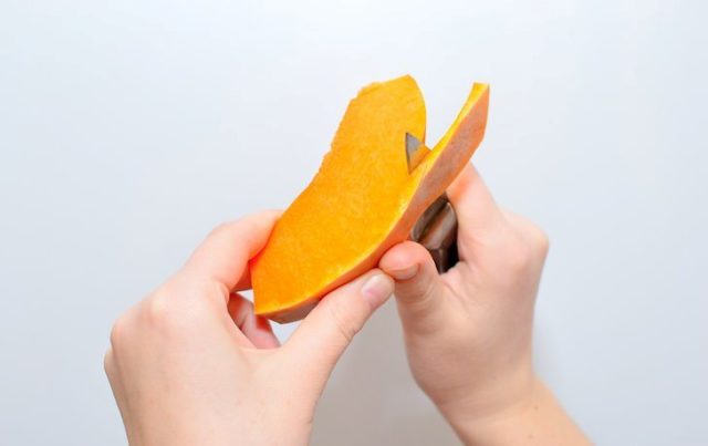 A sütőtök kockákra vágása a legegyszerűbb módja egy zöldség fagyasztásának télire. Ebben a formában csak a nyers tök fagyott le, ezért mindenekelőtt meg kell szabadítani a bőrtől. Ezt éles késsel teheti meg, ha a zöldség felét függőlegesen helyezi el. Vagy használhat speciális hámozót, ha a héj vastagsága lehetővé teszi ezt.
