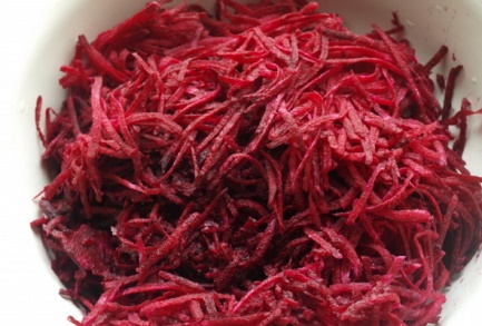 Így egyes saláták elkészítése fagyasztott. A főzési folyamat ugyanaz, mosással kezdődik. Ezután a gyökérzöldséget megfőzzük, bár egészben megsütheti a sütőben. Főzés után a zöldséget le kell hűteni és meg kell hámozni. Csak akkor a gyökérnövényt dörzsölik egy nagy vagy közepes reszelőre, a háziasszony preferenciáitól függően.