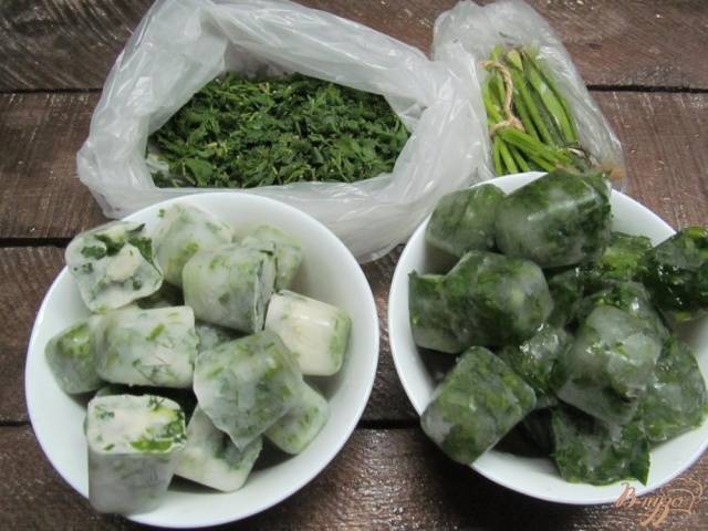 - Ha egy a zöldeket finomra vágja és lefagyasztja ebben a formában jelentősen megtakaríthatja a főzési időt. Csak ez a módszer igényli a mosott növények nagyon jó minőségű szárítását, különben a fagyás eredményeként egy nagy zöld fagyasztott csomó alakul ki. A jól megszárított gyógynövényt levágják, és egy edénybe teszik, ahonnan a fűszereket egyszerűen kanállal fel lehet venni.